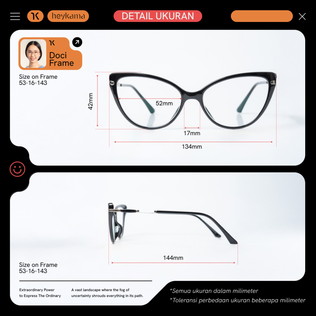 Hey, Kak! Sebelum membeli, mohon dibaca dulu yaa, karena: Membeli artinya udah setuju dengan semua ketentuan Membeli artinya udah paham semua detail produk yang akan dibeli — Frame yang bikin kamu berkarisma di mana aja! Kamu yang suka tampil menonjol, ada nih cat-eye essential yang lumayan bold buat kamu! Tapi Doci masih keliatan natural dan timeless loh, jadi masih bisa banget dipake kemana aja! Kenapa pilih Doci? Style modern Ringan Kokoh Pilihan warna beragam dan menarik Cocok untuk semua bentuk wajah Eksplor style kamu bareng Doci! Kayak desainnya yang berani, Doci tuh cocok banget buat kamu yang talk less do more, terutama kalau kamu orang yang kreatif dan ekspresif. Kamu pake Doci kemanapun, bakalan bikin kamu keliatan smart dan chic sekaligus. Kebayang secakep apa? Kalau soal mix & match sih, Doci masih fleksibel banget loh dari penampilan profesional, casual, sampai dress formal. Kamu harus tetep bawa-bawa kesan bold yang elegan kan? Makanya ada Doci. Yang pasti cocok pake Doci nih! Penulis, desainer, mahasiswa pascasarjana, atau creative worker yang lebih memilih suasana sunyi, sudut perpustakaan, atau coffee shop indie sebagai tempat mengembangkan ide. Spesifikasi Doci Bentuk: Cat-eye Gender: Perempuan Material: TR90 Pilihan warna: Black, Soft Brown, Mist, dan Crystal Fitur: Terdapat nose pads tanam Terdapat per, bisa melebar ke samping. Bonus: Hardcase premium, lap microfiber, pembersih lensa, dan garansi seumur hidup. Rekomendasi Ukuran wajah: medium ke kecil atau lebar Ukuran lensa: maksimal minus 3 (Di atas minus 3 disarankan untuk mempertipis lensa) Warna kulit: Putih: semua warna Kuning Langsat: semua warna Sawo Matang: semua warna Frame serupa: Shuji (versi lebih lebar) Cara Order Frame + Lensa (Ganti Lensa): 1. Kamu harus memesan 2 produk ya! (1 frame dan 1 lensa) 2. Pilih frame dan warna yang kamu mau, masukkan ke keranjang 3. Pilih jenis lensa yang kamu mau, masukkan ke keranjang 4. Di keranjang, ceklis kedua produk lalu pilih “Checkout” 5. Jangan lupa tulis resep lensa kamu di Catatan/Pesan ya! 6. Setelah itu, pilih “Buat Pesanan” dan lanjutkan ke pembayaran Komplain: 1. Kalau ada masalah sama produknya, kamu bisa ajuin komplain maksimal H+1 sejak produknya sampai ya! 2. Syarat komplainnya, kamu wajib menyertakan video unboxing tanpa jeda! 3. Kami nggak bisa terima komplain apa pun kalau kamu nggak menyertakan video unboxing tanpa jeda nih 🙁 Nah, kalau kamu udah order artinya kamu setuju dengan semua ketentuan di atas yaa! Happy shopping!