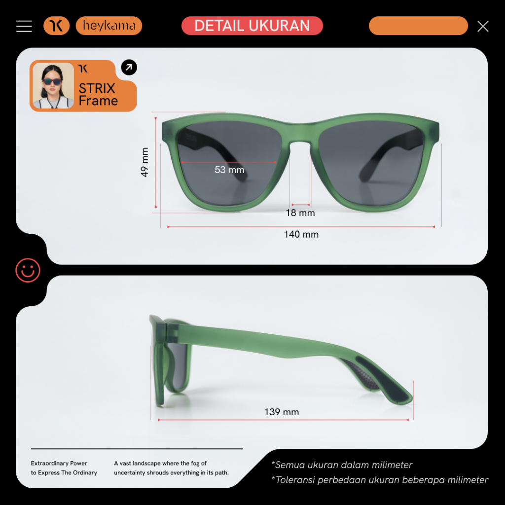 Hey, Kak! Sebelum membeli, mohon dibaca dulu yaa, karena: Membeli artinya udah setuju dengan semua ketentuan Membeli artinya udah paham semua detail produk yang akan dibeli — Bikin sport-lifestyle kamu lebih solid dan berkarakter Strix tuh frame sport-lifestyle yang lebih solid dan berkarakter. Lebih dari sekadar kacamata sport atau casual sunglasses, Strix match buat kamu yang mau ngasih kesan aktif dan percaya diri dengan attitude yang kuat! Kenapa pilih Strix? Style modern Ringan Kokoh Pilihan warna menarik Cocok untuk banyak bentuk wajah Enaknya pake Strix tuh: Material polycarbonate-nya ringan, tahan benturan, dan cocok buat pemakaian intens di luar ruangan. Bahkan bukan cuma di satu momen aja, tapi cocok buat gaya hidup aktif yang konsisten. Lensanya udah polarized yang anti pantul. Strix bakalan cocok sama kamu yang penuh percaya diri, nyaman jadi perhatian, aktif di luar, dan punya taste yang kuat. Suka kepraktisan yang impactful buat jalanin hari dengan energi tinggi? Pilih Strix aja! Yang pasti cocok pake Strix nih! Pekerja dengan eksposur sosial dan mobilitas tinggi, di antaranya creative & media professionals, urban professionals & lifestyle-driven, entrepreneur, pemilik bisnis, traveler, event crew, dan pekerja di bidang hospitality. Spesifikasi Strix Bentuk: Square (Lifestyle-Sport Frame) Gender: Unisex Material: Polycarbonate & Polarized Lenses Pilihan warna: Army, Phantom, dan Orchid Fitur: Lensa polarized dan tidak kaku Bonus: Hardcase premium, lap microfiber, pembersih lensa, dan garansi seumur hidup. Rekomendasi Ukuran wajah: medium ke lebar (wajah kotak akan semakin tegas) Bentuk wajah: cocok di semua bentuk wajah kecuali wajah kotak akan semakin tegas Warna kulit: Putih: semua warna Kuning Langsat: semua warna Sawo Matang: semua warna Komplain: 1. Kalau ada masalah sama produknya, kamu bisa ajuin komplain maksimal H+1 sejak produknya sampai ya! 2. Syarat komplainnya, kamu wajib menyertakan video unboxing tanpa jeda! 3. Kami nggak bisa terima komplain apa pun kalau kamu nggak menyertakan video unboxing tanpa jeda nih 🙁 Nah, kalau kamu udah order artinya kamu setuju dengan semua ketentuan di atas yaa! Happy shopping!
