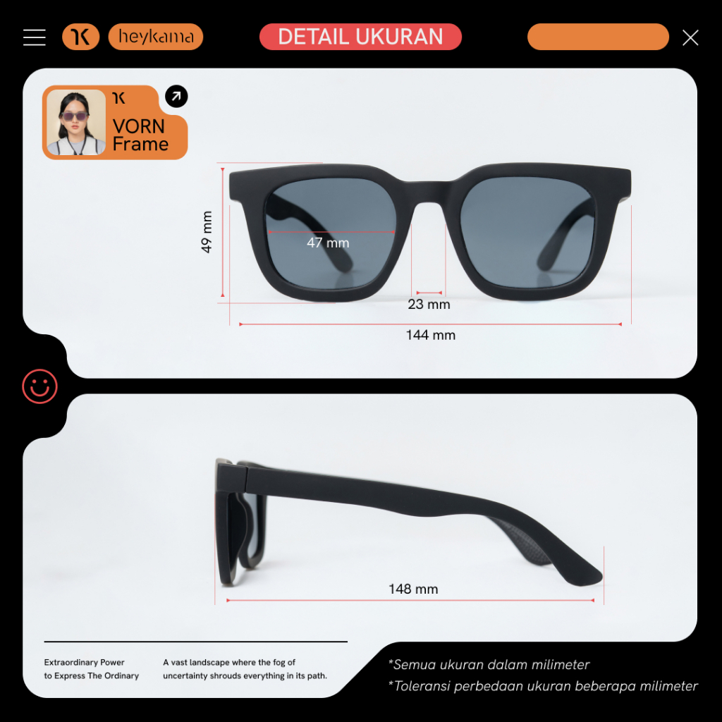 Hey, Kak! Sebelum membeli, mohon dibaca dulu yaa, karena: Membeli artinya udah setuju dengan semua ketentuan Membeli artinya udah paham semua detail produk yang akan dibeli — Kacamata sport yang lebih modern casual nih! Vorn tuh tipe kacamata sport yang clean, rapi, dan approachable. Sudut lembutnya bikin keliatan friendly dan timeless. Pas buat kamu yang suka tampil netral dan fleksibel soalnya Vorn gampang masuk ke lifestyle apa pun tanpa ngasih kesan terlalu sporty! Kenapa pilih Vorn? Style modern Ringan Kokoh Pilihan warna menarik Cocok untuk banyak bentuk wajah Enaknya pake Vorn tuh: Bisa dipake buat daily use soalnya ringan dan nyaman dipake lama. Lensa polarized-nya bisa ngurangin pantul. Desainnya tuh cocok banget buat kamu yang easy-going, rapi, bersih, konsisten, dan nggak mau menonjol tapi peduli sama detail dan kualitas. Auranya tuh quiet confidence gitu deh. Pake Vorn bikin kamu tampil clean dan timeless di setiap ritme hidup kamu yang seimbang itu! Yang pasti cocok pake Vorn nih! Profesi dengan ritme kerja stabil, banyak interaksi sosial, dan kebutuhan tampil rapi tapi santai seperti: pekerja kantoran profesional, pekerja di bidang kreatif dan komunikasi, entrepreneur, freelancer, dan pekerja di bidang pendidikan atau layanan. Spesifikasi Vorn Bentuk: Square (Lifestyle-Sport Frame) Gender: Unisex Material: Polycarbonate & Polarized Lenses Pilihan warna: Phantom, Ash Pink, dan Frost Brown Fitur: Lensa polarized dan tidak kaku Bonus: Hardcase premium, lap microfiber, pembersih lensa, dan garansi seumur hidup. Rekomendasi Ukuran wajah: kecil ke lebar Bentuk wajah: cocok di semua bentuk wajah kecuali wajah kotak akan semakin tegas Warna kulit: Putih: semua warna Kuning Langsat: semua warna Sawo Matang: kecuali Ash Pink Komplain: 1. Kalau ada masalah sama produknya, kamu bisa ajuin komplain maksimal H+1 sejak produknya sampai ya! 2. Syarat komplainnya, kamu wajib menyertakan video unboxing tanpa jeda! 3. Kami nggak bisa terima komplain apa pun kalau kamu nggak menyertakan video unboxing tanpa jeda nih 🙁 Nah, kalau kamu udah order artinya kamu setuju dengan semua ketentuan di atas yaa! Happy shopping!